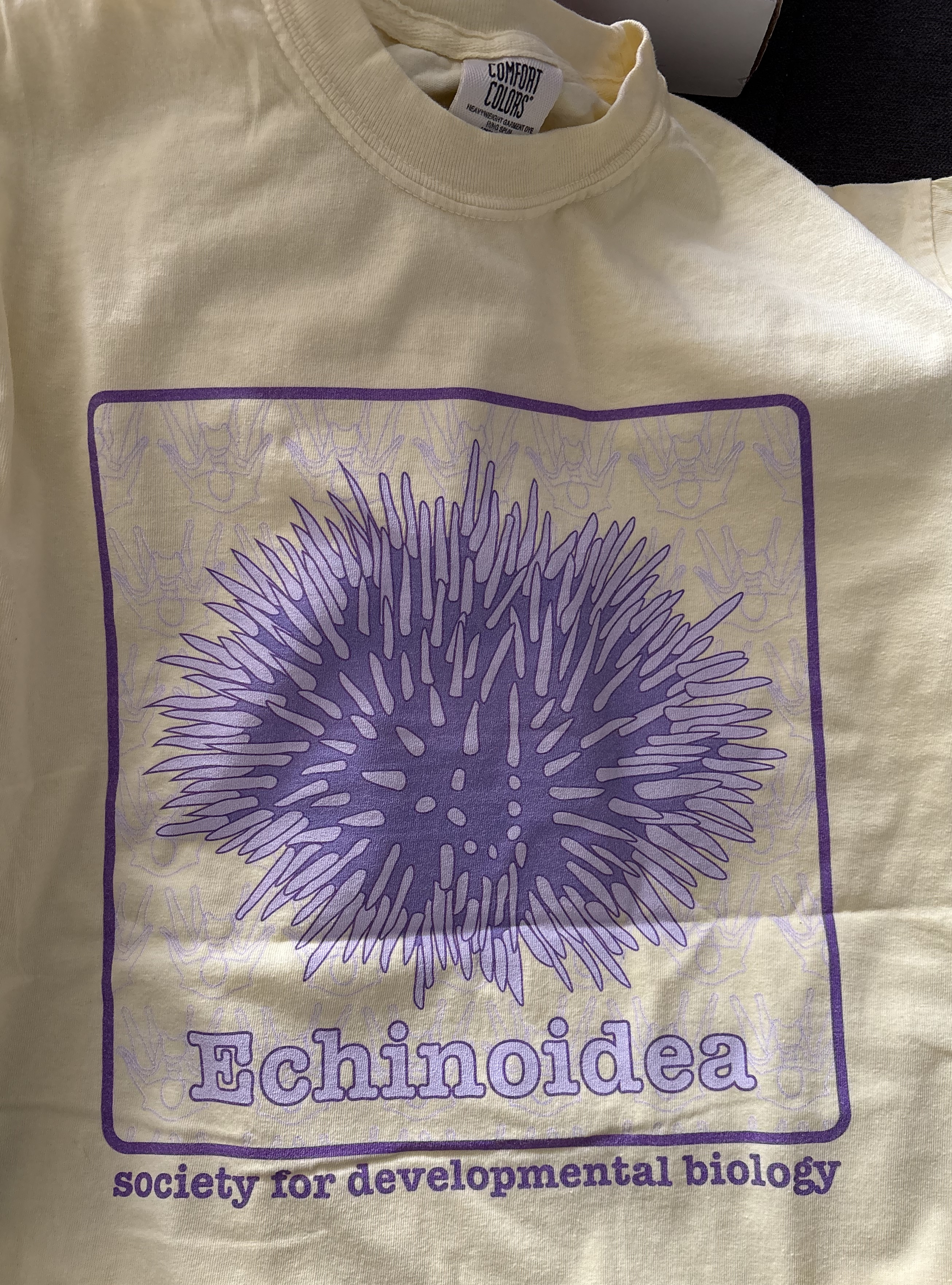 Represent the sea urchin community in SDB's exclusive Echinoidea design, printed on a 100% ring-spun cotton Comfort Colors garment-dyed t-shirt. Available in white and butter.